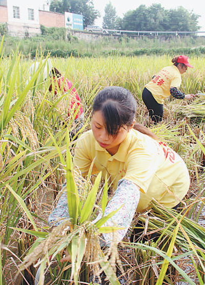 张雪带领村青年党员帮助农户收割稻谷。资料图片