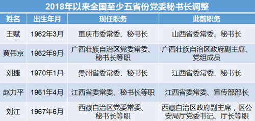 此外,三人为本省转任,且三人的任职经历都一直在本省。他们是:广西壮族自治区党委常委、秘书长黄伟京,江西省委常委、秘书长赵力平和西藏自治区党委常委、秘书长刘江。其中,黄伟京和刘江此前均担任省级政府副职。