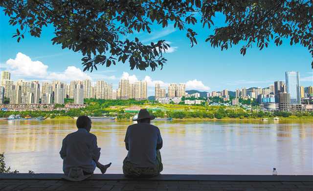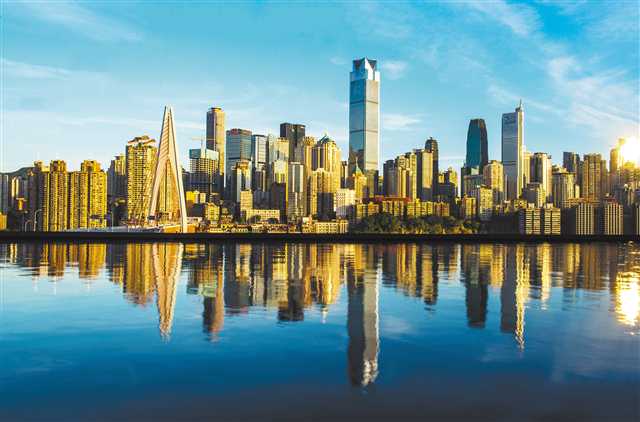 七月十五日,蓝天白云下,渝中半岛在水中的倒影令人陶醉。记者 齐岚森 摄