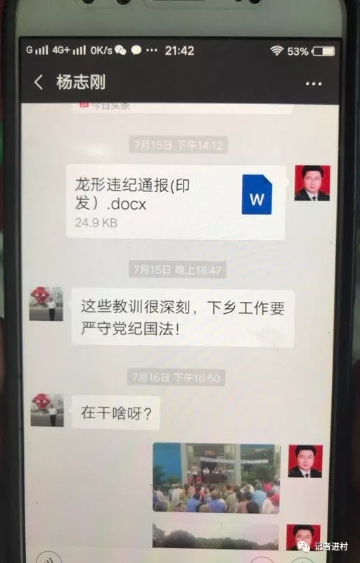儿子发来一个违纪通报,父亲提醒“这些教训很深刻,下乡工作要严守党纪国法!”并告诉儿子,“热情、周到、廉洁”是干部的基本素质”。