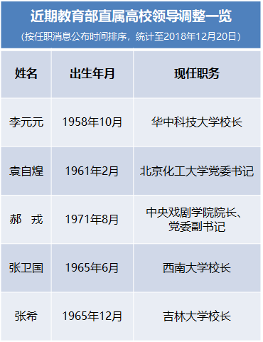 据统计,11月以来,至少已有5所教育部直属高校党委书记或校长履新。分别是:李元元任华中科技大学校长,袁自煌任北京化工大学党委书记,郝戎任中央戏剧学院院长,张卫国任西南大学校长,张希任吉林大学校长。