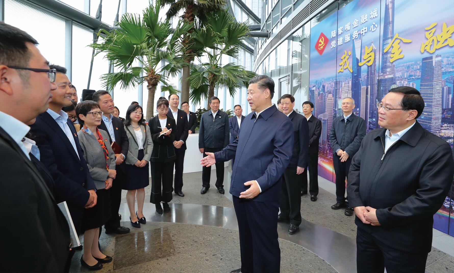 2018年11月6日,习近平在上海中心大厦22层的陆家嘴金融城党建服务中心,同正在联合开展主题党日活动的企业党员亲切交谈。新华社记者 谢环驰摄