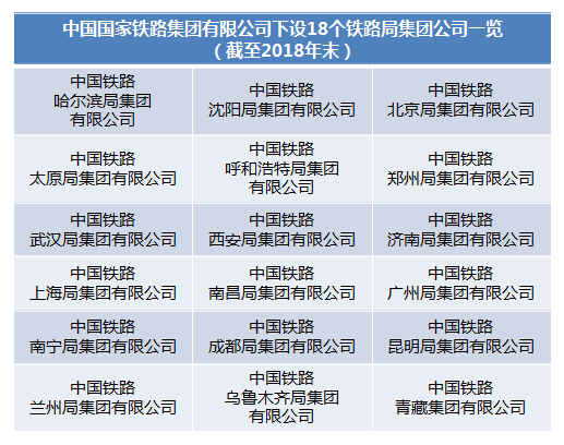 截至2018年末,中国国家铁路集团有限公司下设18个铁路局集团公司,具体情况如下: