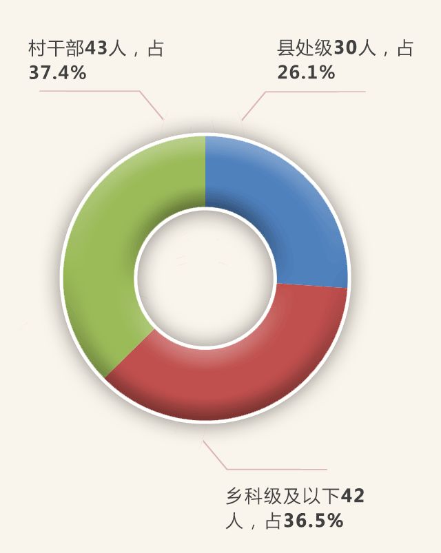 被问责的115人中,县处级30人,占26.1%;乡科级及以下42人,占36.5%;村干部43人,占37.4%。