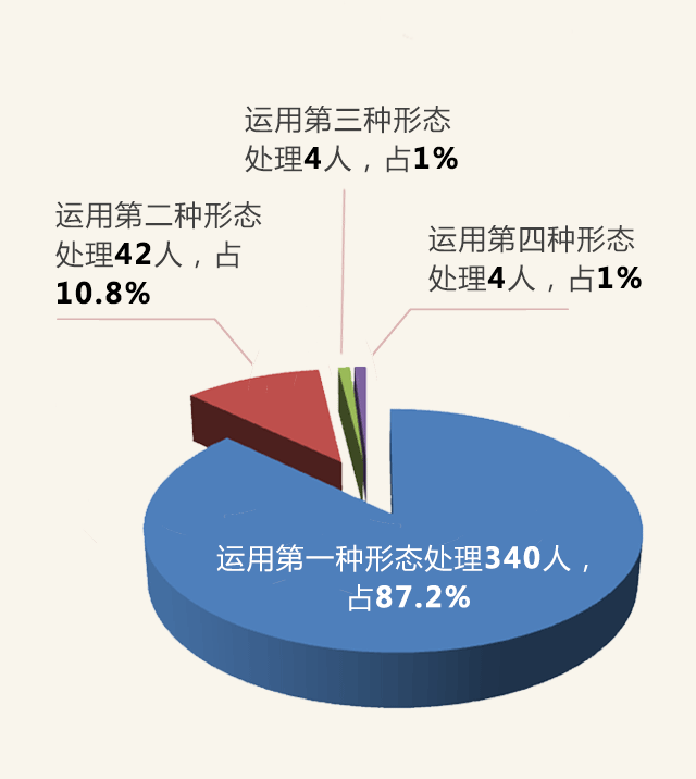 第一种形态处理340人,占87.2%;第二种形态处理42人,占10.8%;第三种形态处理4人,占1%;第四种形态处理4人,占1%。