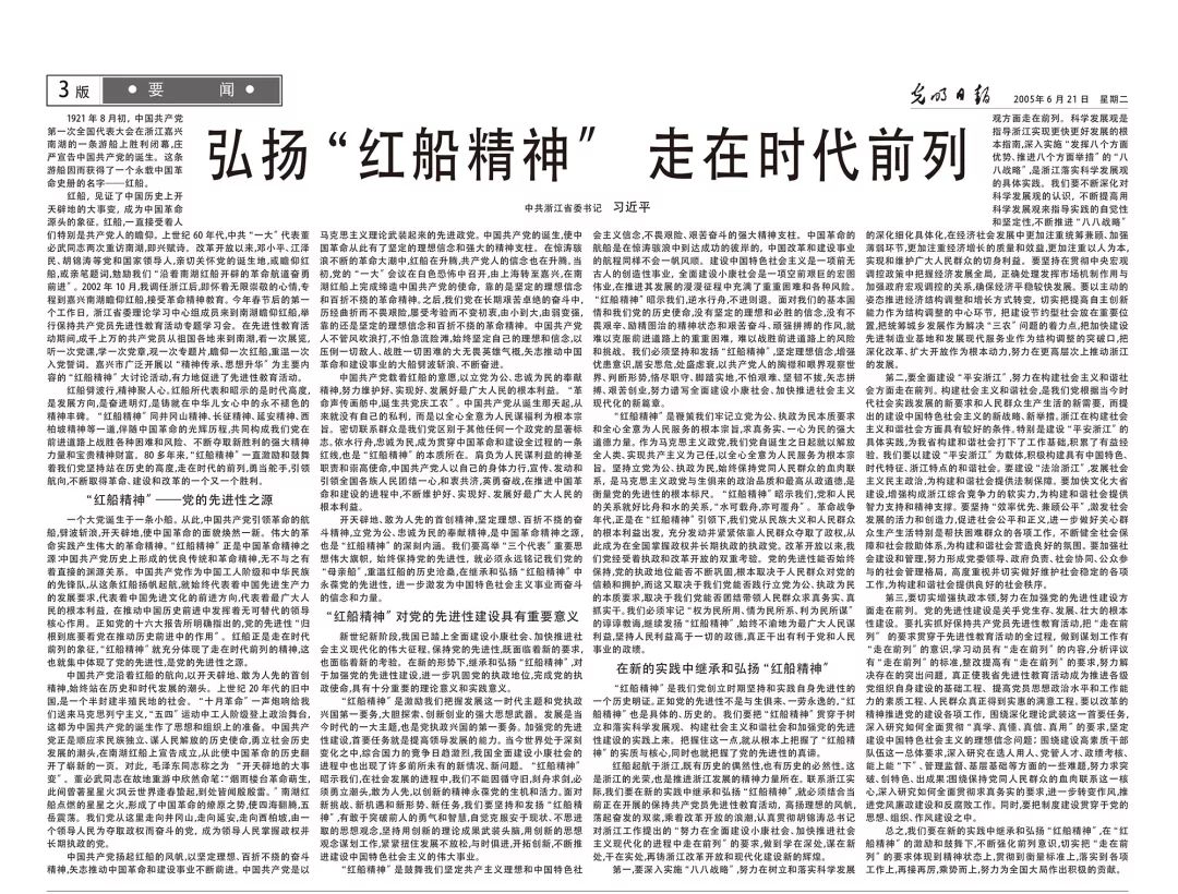 2005年6月21日,时任浙江省委书记的习近平同志在《光明日报》发表文章《弘扬“红船精神” 走在时代前列》,首次概括了红船精神的深刻内涵和历史地位,阐述了中国共产党的源头精神。