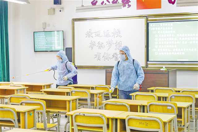 ▲4月9日,南开中学工作人员正在进行教室消毒。(南开中学供图)