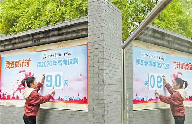 ▲4月8日,永川北山中学高三老师在校园布置2020年高考倒计时牌。通讯员 陈仕川 摄