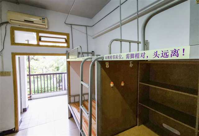 ▲4月9日,南开中学在男生宿舍床上贴保持距离的标语。记者 苏思 摄