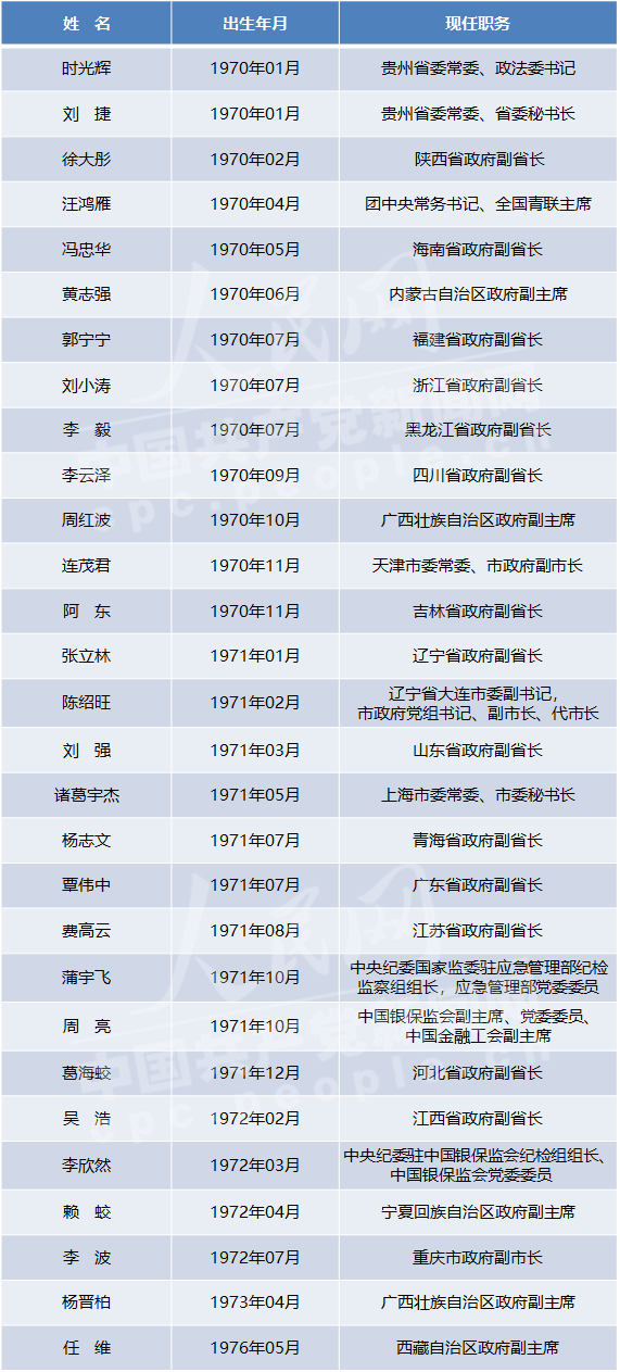 根据公开信息,2019年全国至少有8名“70后”干部迈入省部级行列。而目前“70后”副部级干部的晋升频率已远远超过去年。不难想见,省部级干部队伍将迎来越来越多的“70后”面孔。