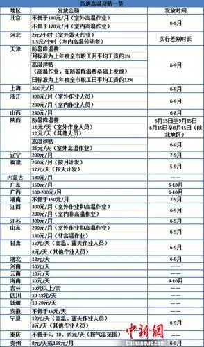 部分省份高温津贴发放标准