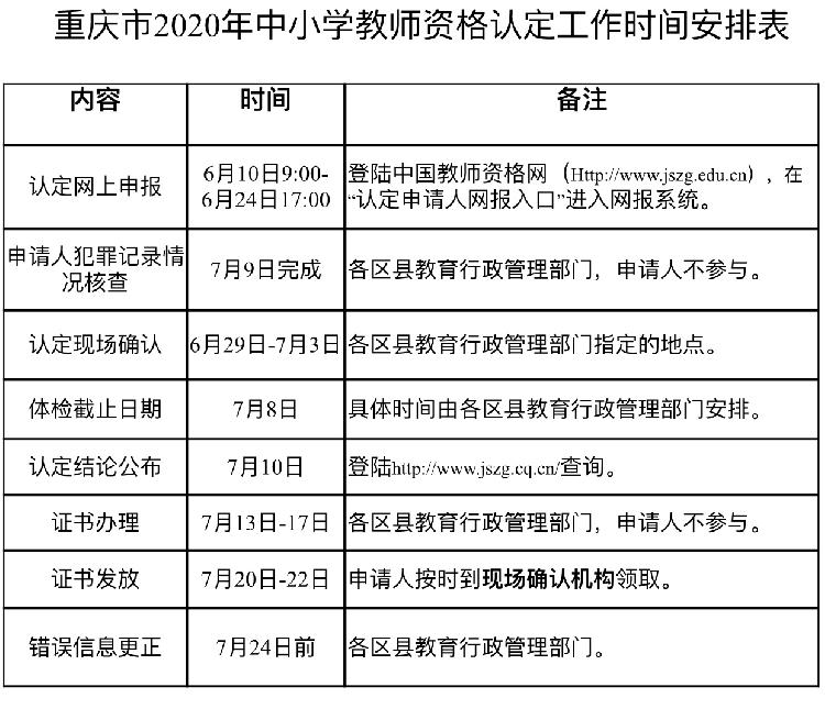 要申请中小学教师资格认定的注意了!5月25日,重庆市教委下发通知,公布了重庆市2020年中小学教师资格认定网报时间为:6月10日9:00—6月24日17:00,符合条件的申请人可登录中国教师资格网(www.jszg.edu.cn.)进行网上申报。