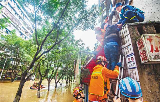 6月22日,綦江区菜坝社区部分居民楼被淹,救援人员紧急转移被困群众。记者 龙帆 摄/视觉重庆