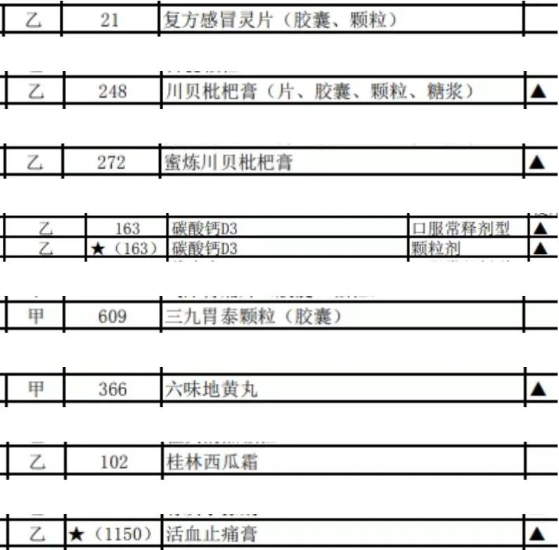 在国家药品目录中,记者找到了传闻中涉及的复方感冒灵片(胶囊、颗粒),蜜炼川贝枇杷膏,川贝枇杷膏(片、胶囊、颗粒、糖浆),碳酸钙D3口服常释剂型,三九胃泰颗粒(胶囊),六味地黄丸,桂林西瓜霜,活血止痛膏,碳酸钙D3颗粒、剂,双黄连片(胶囊、颗粒、合剂、口服液)。仅奇正消痛贴膏没有搜到。