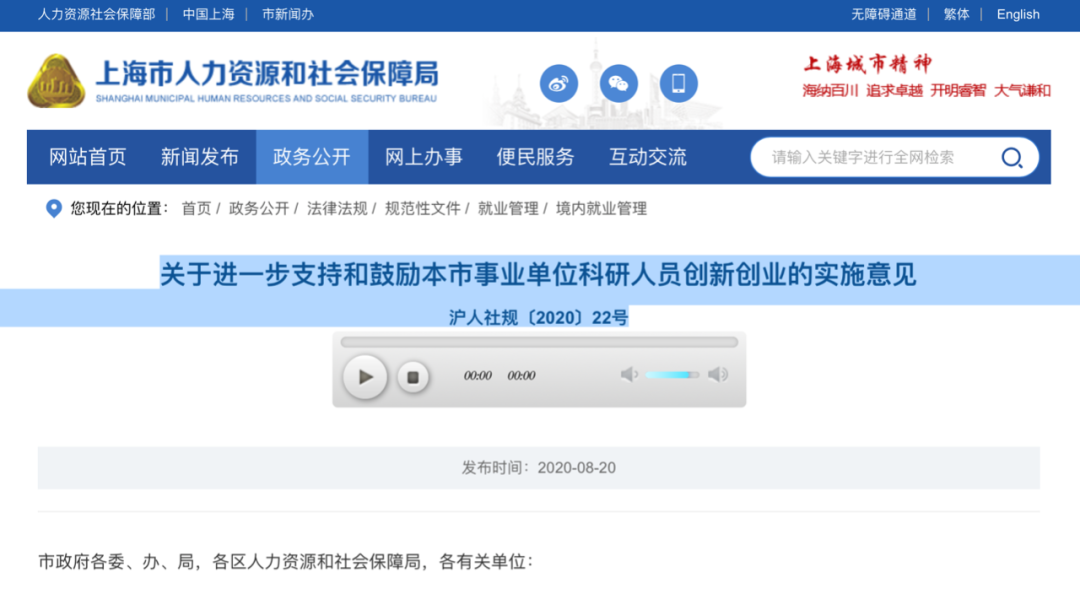 近日,上海市人力资源和社会保障局发布《关于进一步支持和鼓励本市事业单位科研人员创新创业的实施意见》。