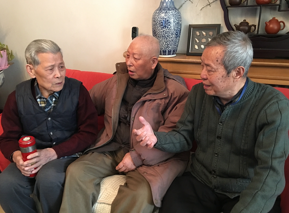 忆及当年,几个老战友如数家珍,感慨系之。和人民军队同龄的徐中年,今年已整整93岁,除了眼神不好,身体还蛮健朗,2016年他在家中回忆,当年晋绥平剧院阵容强大,人才济济,最多时约有两百人。他掰着手指说,四班是“女生班”,二班是“大鬼班”,三班是“小鬼班”。“小鬼班”一共7个人,班长王俊杰,我是副班长,带着五个小的,郝月长、霍宏亮、王举、王会卿、郭玉培。自陕北分开直至两三年后解放,王举、霍宏亮到重庆上了第二高级步兵学校,毕业被分配到昆明工作。徐老紧紧握住郝月长、霍宏亮两位老战友的手说:“现在只剩下我们三个了。”