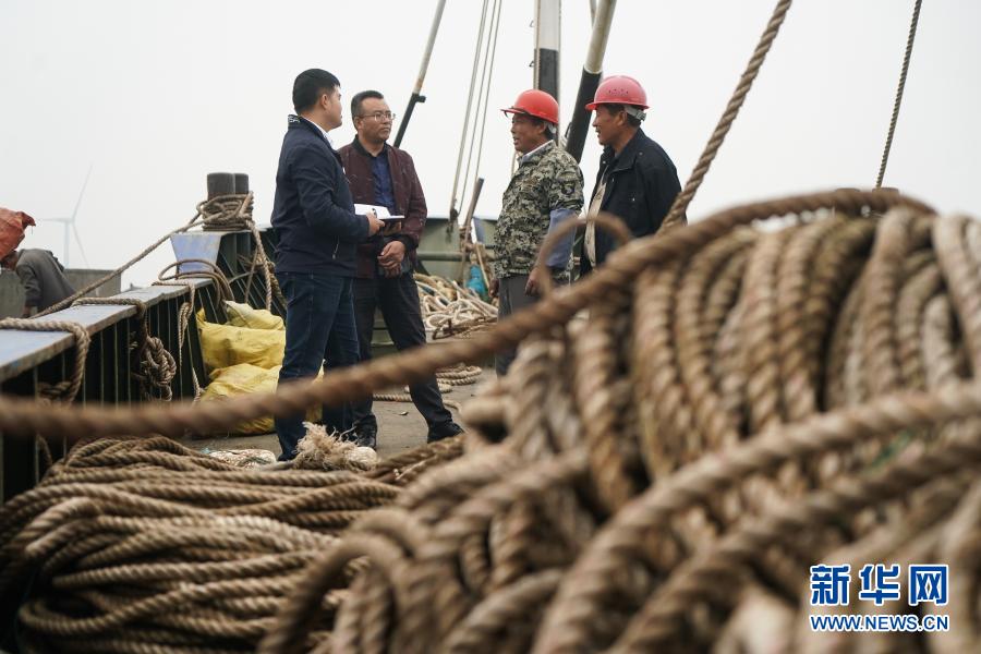 2020年10月21日,江苏省海安市滨海新区纪工委干部(左一、左二)向渔船负责人询问惠渔油补发放情况。 新华社记者 季春鹏 摄
