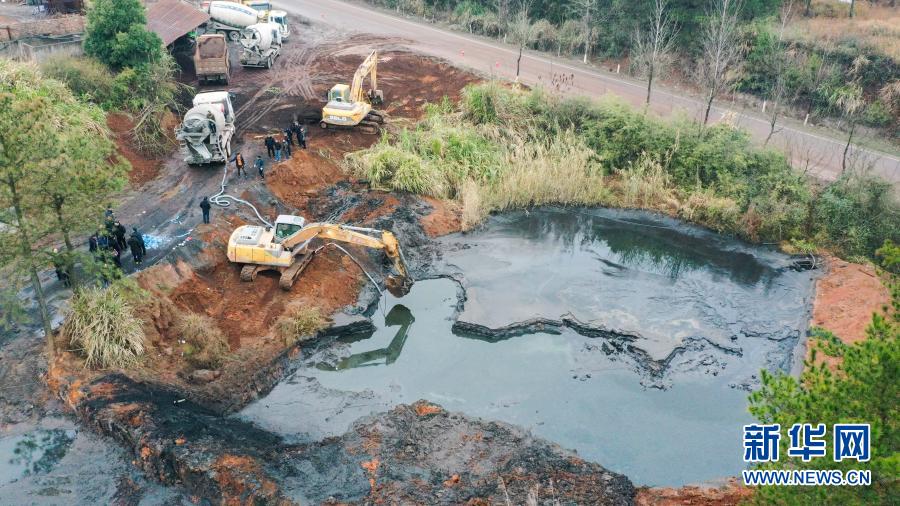 1月7日,在湖南省茶陵县洣江街道诸睦村和建矿业有限公司,茶陵县多部门工作人员在抓紧清理尾矿库的废水和淤泥(无人机照片)。 新华社发