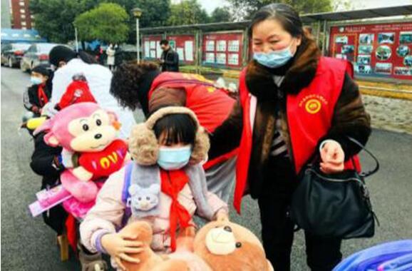 图为组织爱心企业、志愿者开展帮扶活动,为留守儿童送上暖冬大礼包