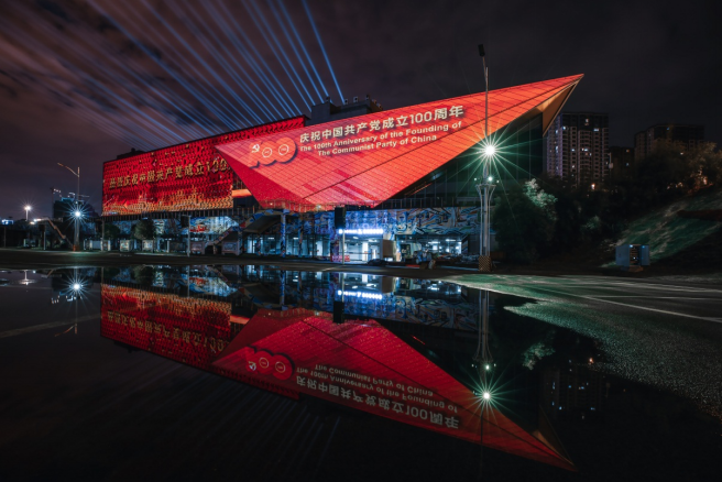 丝路花街建筑夜间灯影秀于7月1日晚间正式点亮。“丝路花街全长1.5公里,灯影景观设计创意来自古代丝绸之路沿途地域特色文化元素。”丝路花街项目建设负责人说。