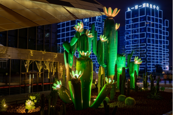 据了解,丝路花街沿街布置了具有异域风情特色的创意艺术装置,还设置了8个具有“一带一路”沿线国家特色的景观小品。五彩缤纷的花卉园艺,配以绚丽多彩的灯饰装置,夜晚投射在1800平方米墙体上的灯光秀,展示丝路文化,呈现绚丽多彩的光影互动体验,为市民营造“白天看花、晚上看灯”的游览体验。