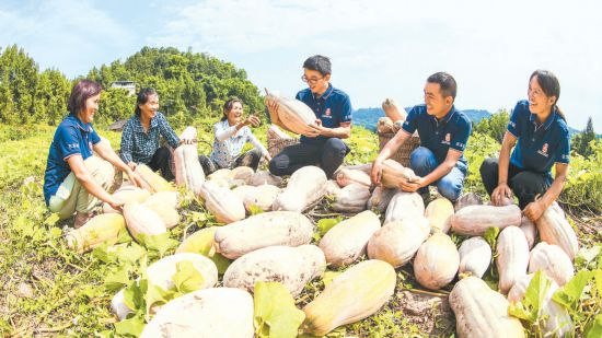 梁平区大观镇大兴村带头人唐俊(左四)带领村民采摘销售蜜本南瓜。