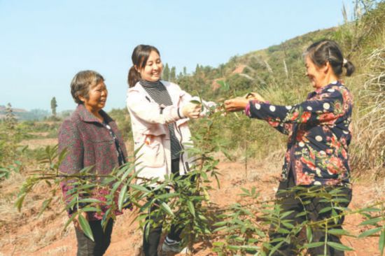 潼南区双江镇白鹤村党支部书记李欣(中)与群众一起查看花椒长势。