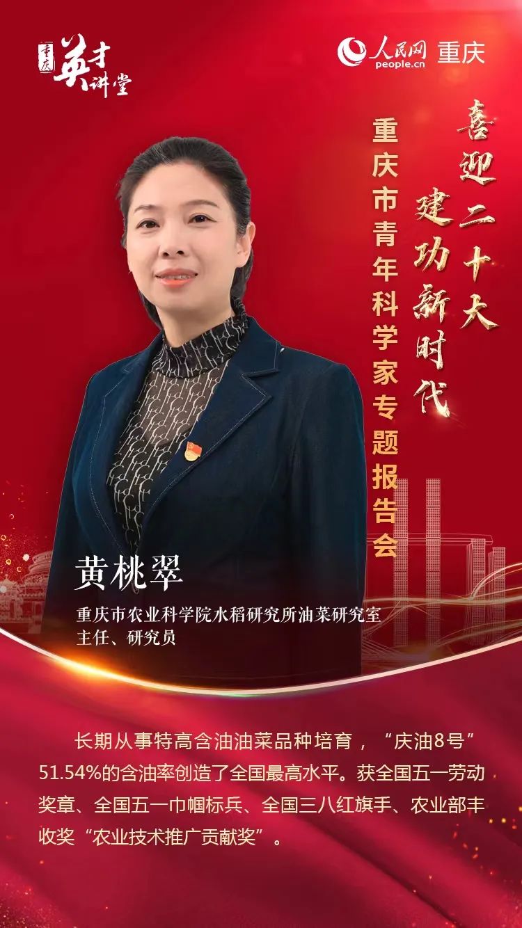 “庆油1号”通过国家审定,“庆油3号”创造中国油菜含油量最高纪录,“庆油8号”再次刷新纪录。近10年,黄桃翠和团队研发的品种,占据了我国油菜高含油量的前三甲。黄桃翠用自己的科研经历告诉人们,只有攥紧中国种子,才能端稳中国饭碗。十多年来,她奋斗在提高油菜出油率的科研一线,把油瓶子拎在了中国人自己手上。