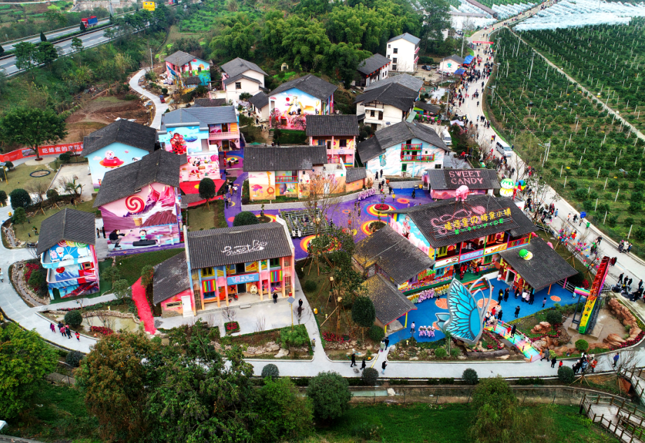 橘源里の糖果小镇位于忠县新立镇双柏村,占地面积约8000平米,是以三峡橘乡为背景、美国迪士尼动漫电影《无敌破坏王》为原型、糖果为主题、儿童乐园为理念,利用老旧房屋改造而成的“三峡橘乡”田园综合体民宿楼群。