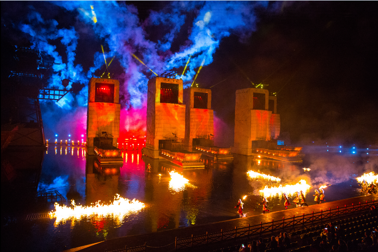 “烽烟三国”实景演艺是该产业园的核心,演绎三国烽烟、关公故事,体现忠义文化主题。该实景演艺以万里长江为背景,以三国文化为主题,通过“桃园结义”、“下邳之战”、“身陷曹营”、“千里走单骑”、“火烧赤壁”、“单刀赴会”、“水淹七军”、“忠义昭千秋”等8个章节再现了关羽忠心报国、义字当先、波澜壮阔的一生。