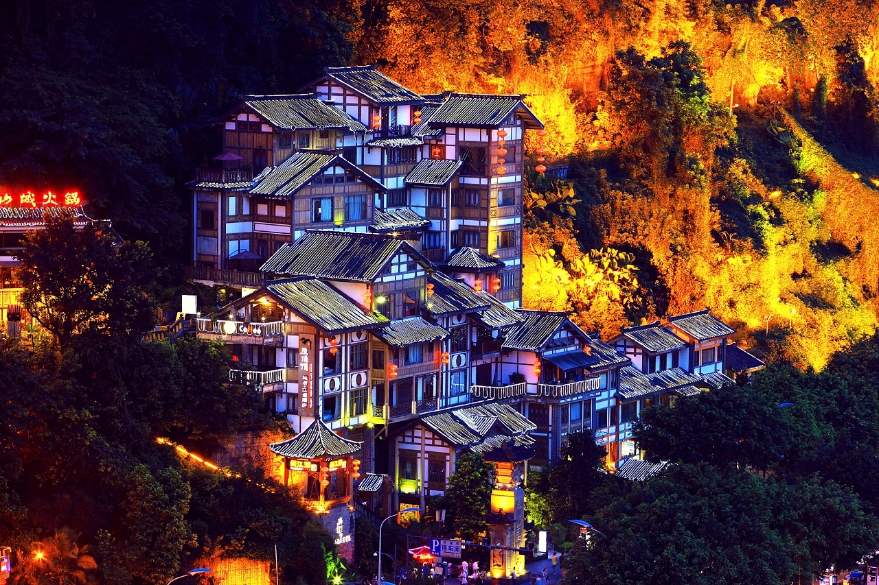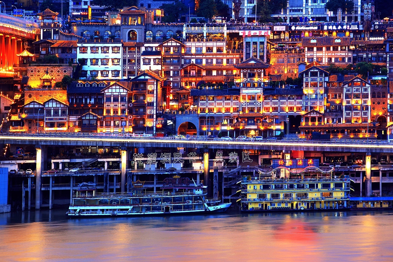 洪崖洞位于重庆市渝中区沧白路,地处长江、嘉陵江两江交汇的滨江地带,以具有巴渝传统建筑特色的“吊脚楼”风貌为主体,依山就势,沿江而建,是兼具观光旅游、休闲度假等功能的旅游区。