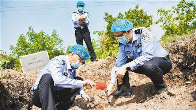 ▲固体废物倾倒现场,民警对发现的异常土壤进行取证。(市公安局环保总队供图)
