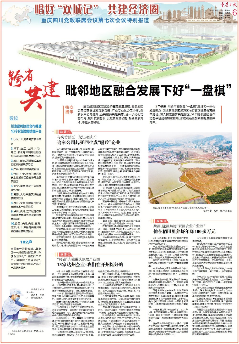 3年多来,川渝牢固树立“一盘棋”思维和一体化发展理念,因地制宜探索经济区与行政区适度分离改革路径,深入探索跨界共建新区,10个毗邻地区合作功能平台建设加速推进,形成联系更加紧密的发展共同体。
