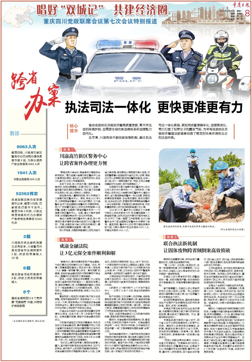 近年来,川渝两地不断创新体制机制,通过执法司法一体化实践,实现两地管理扁平化,治理高效化,有力打击了犯罪分子的嚣张气焰,为书写成渝地区双城经济圈建设新篇章创造了稳定的社会环境和公正的法治环境。