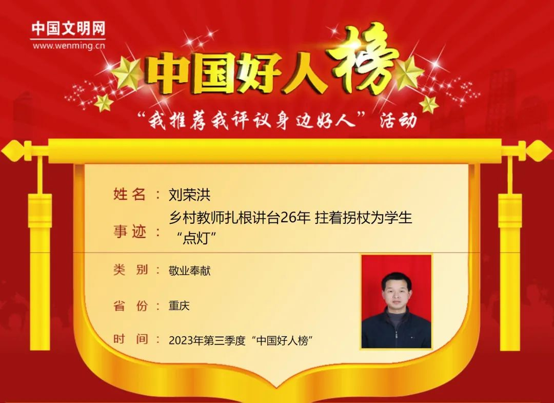 刘荣洪,男,1975年3月生,重庆市南川区第三中学教师。1997年,刚大学毕业的刘荣洪,回到家乡中学任教,拒绝了调回城里的机会,在山村讲台一站就是26年。2019年,刘荣洪在罹患硬脊膜动静脉瘘之后,为了不让学生落下课程,他依然忍痛拄拐坚持教学,从不迟到早退、缺课请假,直到病情严重,才利用假期时间到医院接受治疗。下了手术台,没过恢复期的他拄着拐杖、扶着墙壁又站上了讲台。刘荣洪曾获“重庆好人”等荣誉。
