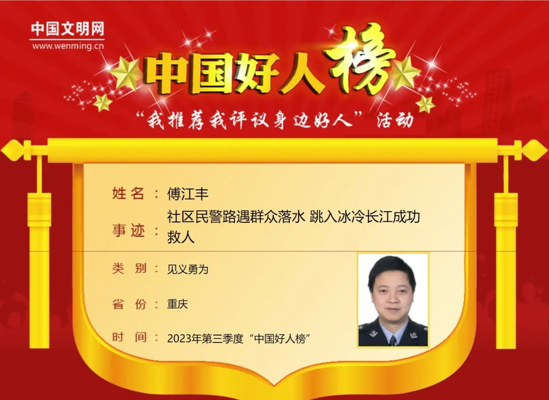傅江丰,男,1974年9月出生,中共党员,重庆市公安局渝中区分局望龙门派出所社区民警。2023年3月24日中午,一男子被卷进长江漩涡,命悬一线,路过的傅江丰果敢跳入冰冷江水,奋力一把将对方推出激流,转危为安。傅江丰曾获“重庆好人”等荣誉。