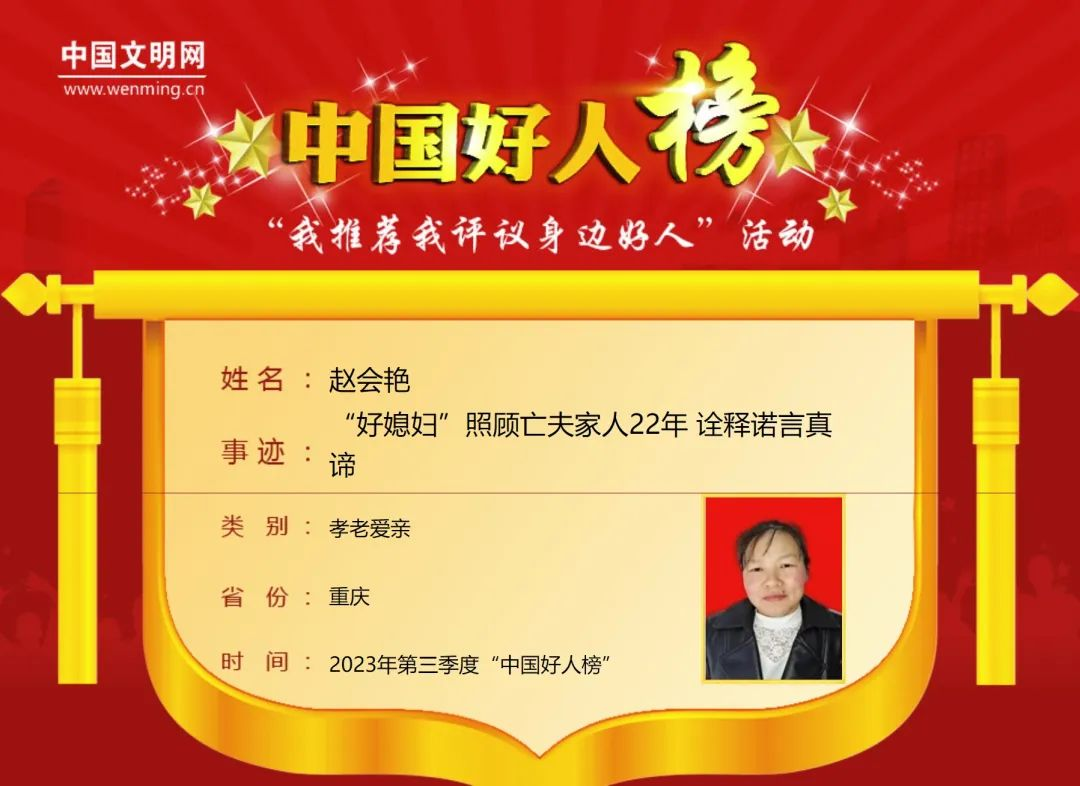 赵会艳,女,1973年10月生,重庆市巫溪县土城镇平头村村民。为了兑现照顾好亡夫家人的承诺,这位朴素的农家妇女22年如一日,依靠勤劳的双手,不仅让年迈多病的公婆、残疾的姑姑和两个年幼孩子得到悉心照顾,还过上了幸福生活,在当地传为佳话。赵会艳曾获“重庆好人”等荣誉。