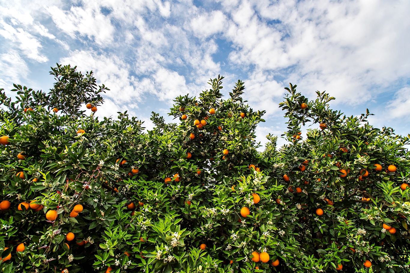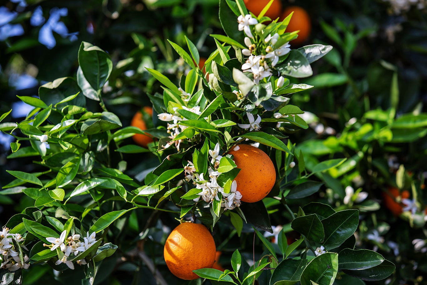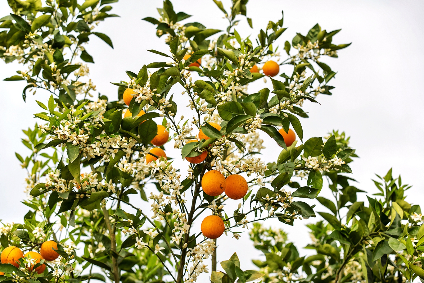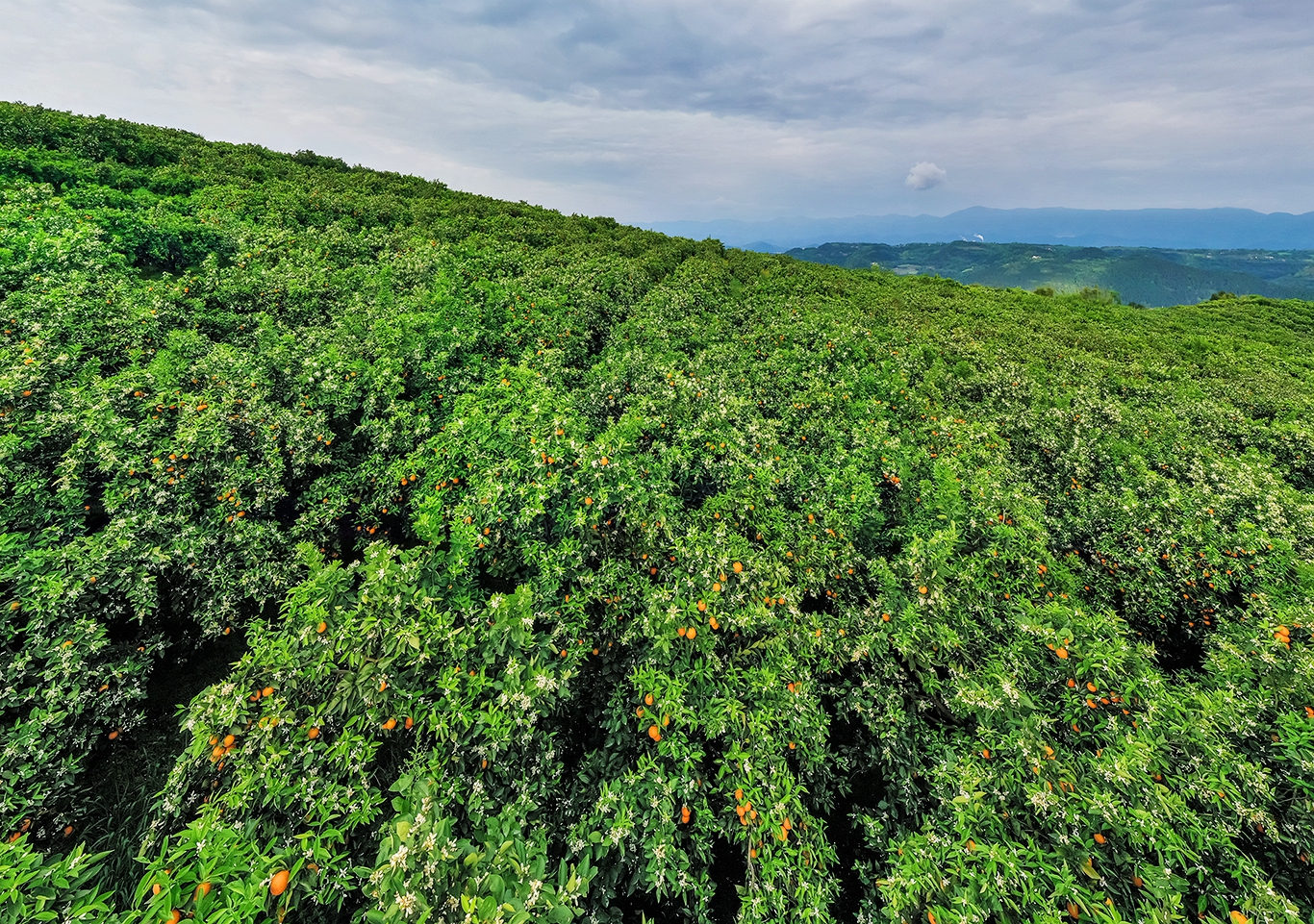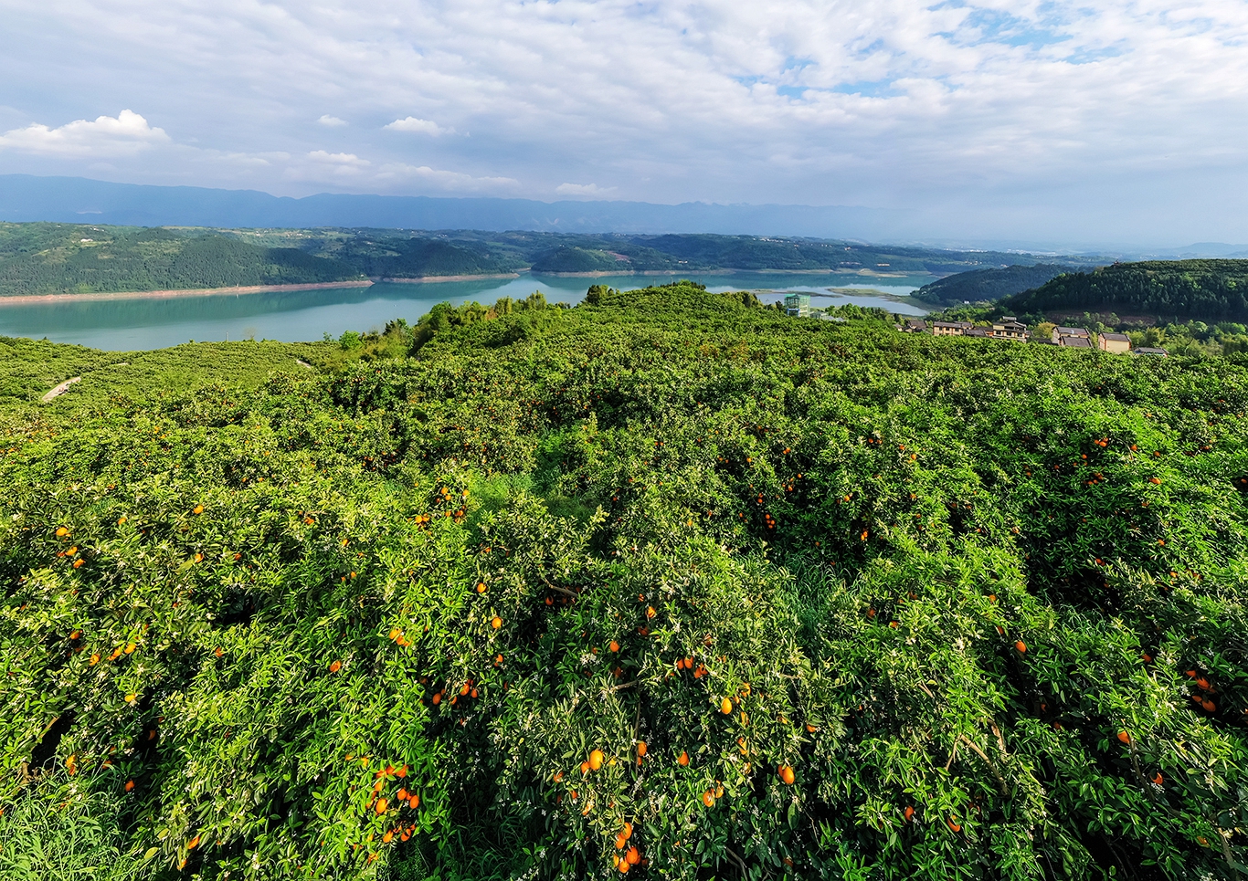 每年四月,三峡橘海绿叶簇拥黄果、黄果点缀白花、白花散发芳香,呈现花果同树的独特奇观,绘就忠县美丽乡村的生态画卷。
