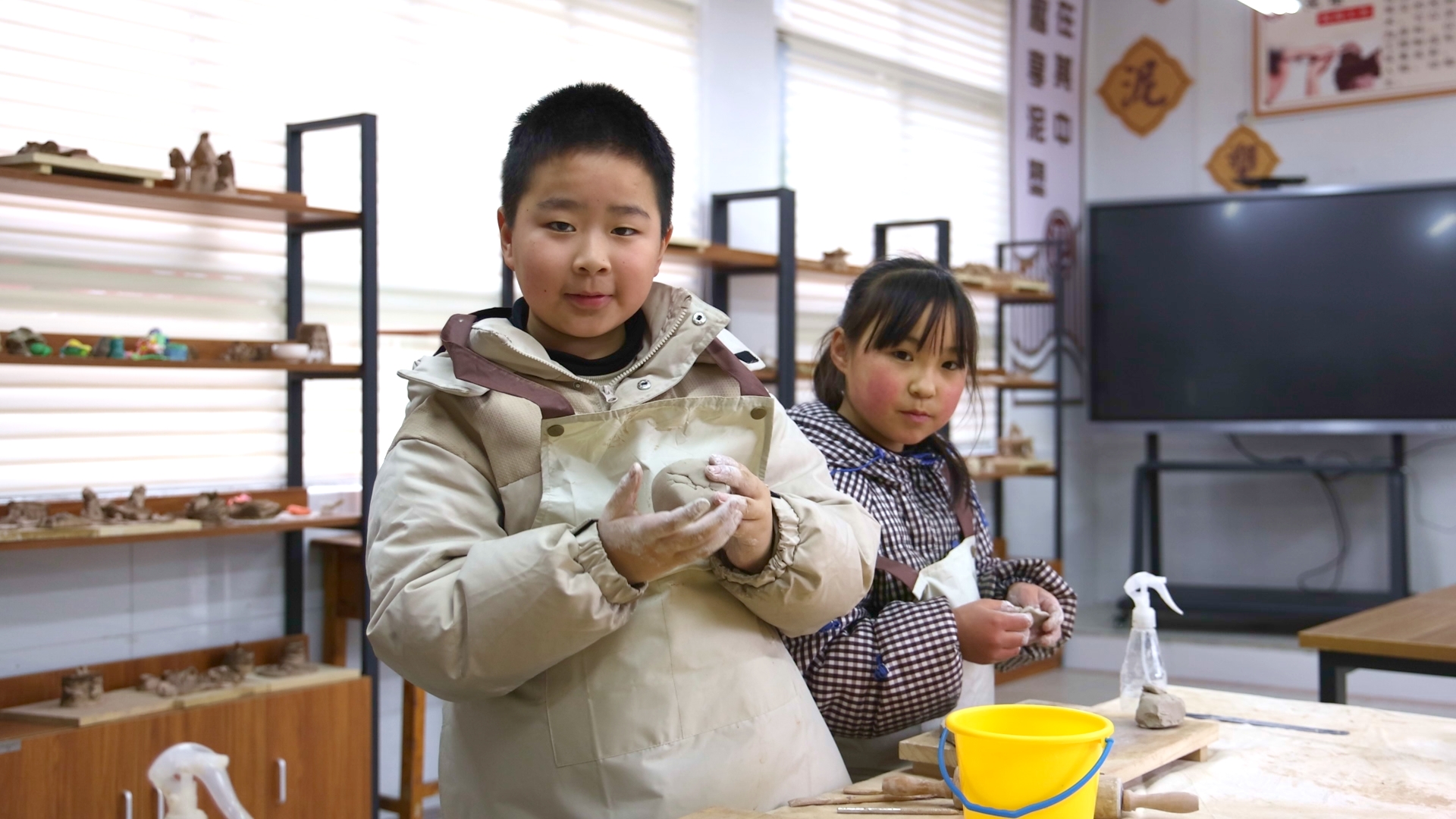在小刺猬面前,几名小学生正在专心地揉泥、雕刻,六年级学生赵正豪便是其中之一。只见他先捏好一个圆球,又拿来刷子、刻刀调整细节,干得有模有样。