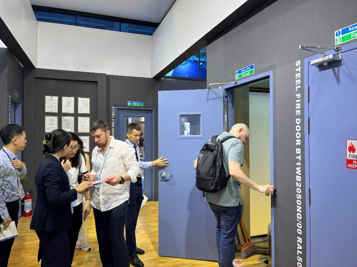 美心集团表示,此次企业参展的主力产品为美标3小时钢制防火门、英标2小时钢制防火门。其中,前者在内部结构中采用加强筋、锁盒和铰链座,大幅增加了门扇稳定性,能够在高温、高压水冲击下保持门扇结构不变形,后者则是前者基础上的“加强版”。