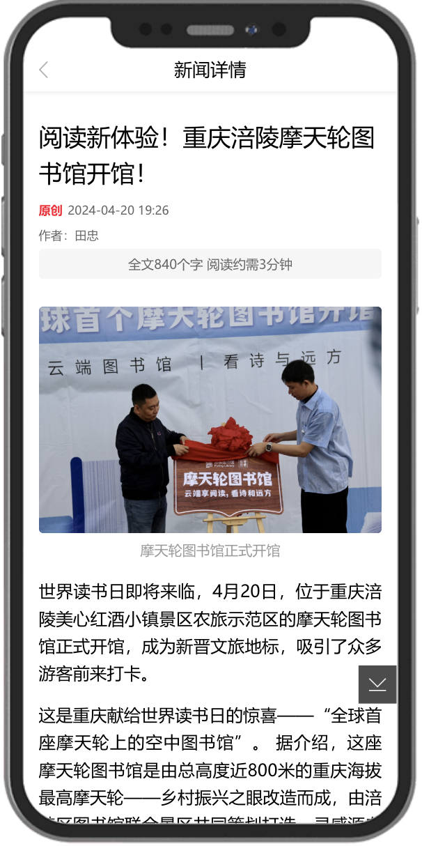 近日,为迎接第29个世界读书日,重庆涪陵美心红酒小镇景区与涪陵区图书馆共同打造的重庆首个“摩天轮图书馆”正式亮相。这一独特的“诗与远方”结合体经七一网等媒体报道后,引发网友广泛关注与热烈讨论,一度登上同城热搜榜。