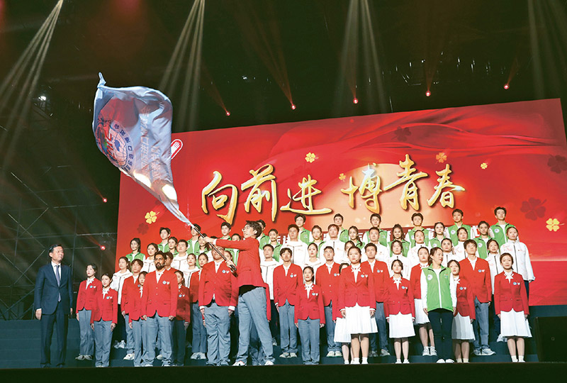 2023年10月17日,第六届中国国际进口博览会志愿者上岗宣誓仪式在国家会展中心(上海)举行,5700余名志愿者宣誓上岗。图为当日拍摄的志愿者总队授旗仪式。 新华社记者 刘颖/摄