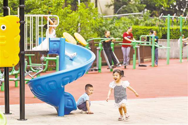 6月17日,渝中区民乐村社区党群服务中心前的微型公园,小朋友在开心地玩耍。