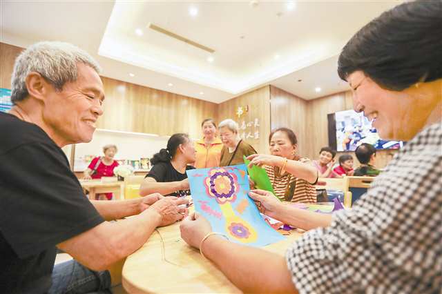 6月17日,渝中区七星岗街道金汤街社区养老服务站,老人们在休息区做手工。