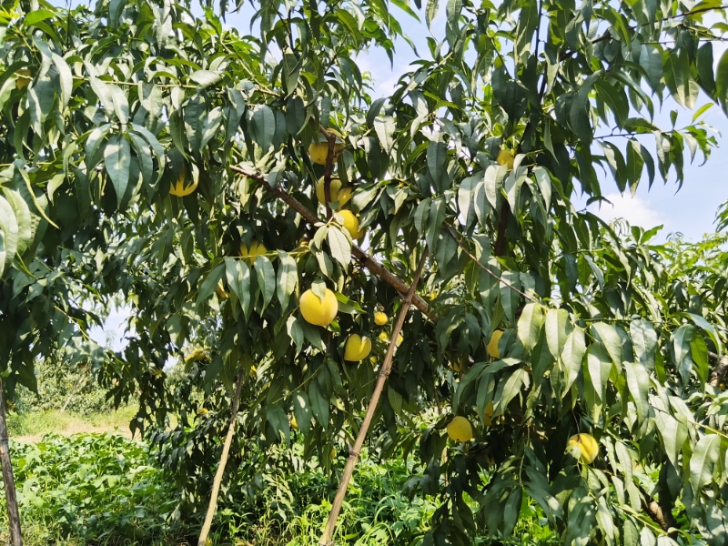 近日,记者在重庆市合川区钓鱼城街道金马村看到一片400亩黄桃基地,硕大的黄桃挂满枝头,有不少树枝被黄桃压弯了“腰”,为预防树枝因果实过重折断,村民用竹竿为一些树枝加了支撑。