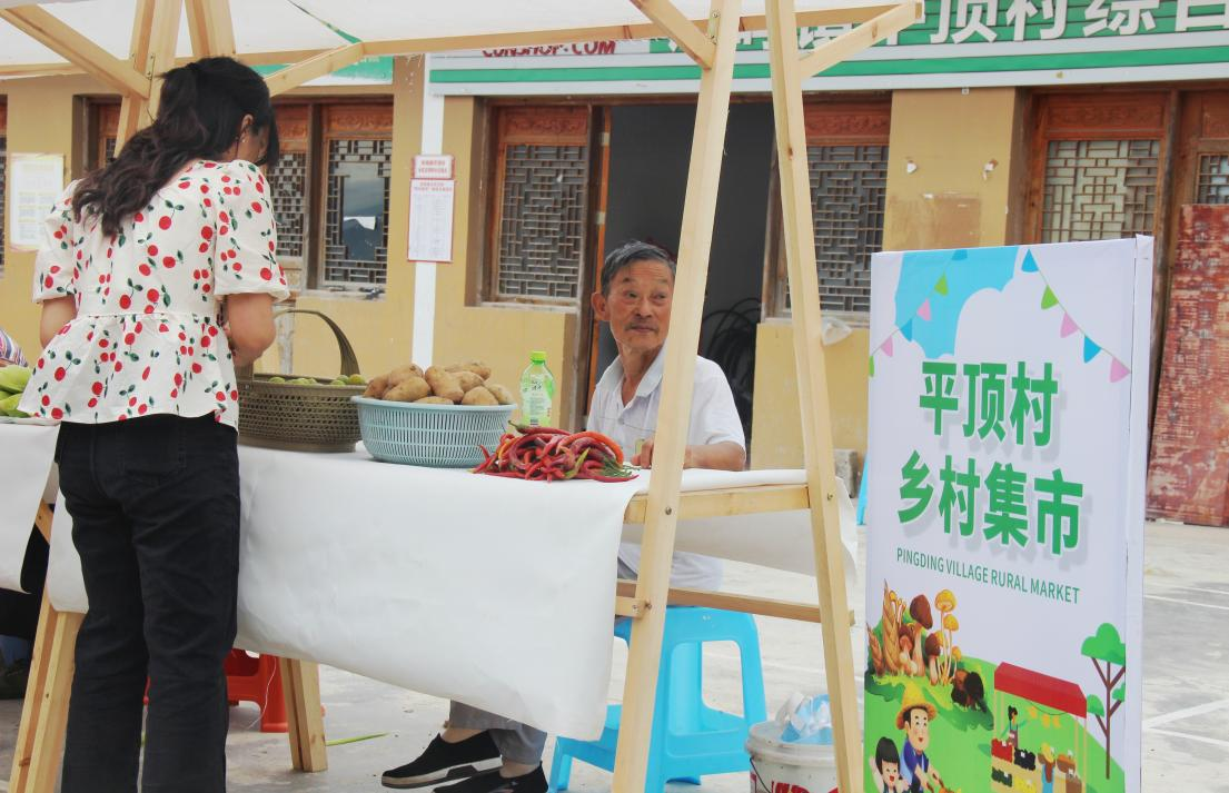 提供要素保障,当好集市售卖“服务员”。在平顶村党群服务中心门口大坝设立临时售卖摊位点,引导村民群众把原路边的摊位迁移至临时售卖点,极大地保证了售卖环境的安全性。工作小组成员协助村民精心布置摊位、规范摆放并帮助售卖农产品,确保集市顺利开市。为抵抗炎热的天气,在党群服务中心提供了临时纳凉休息区,还贴心配备了防暑药包、爱心凉茶、手机充电等多项便捷服务,以满足售卖村民在炎热天气的防暑需求。