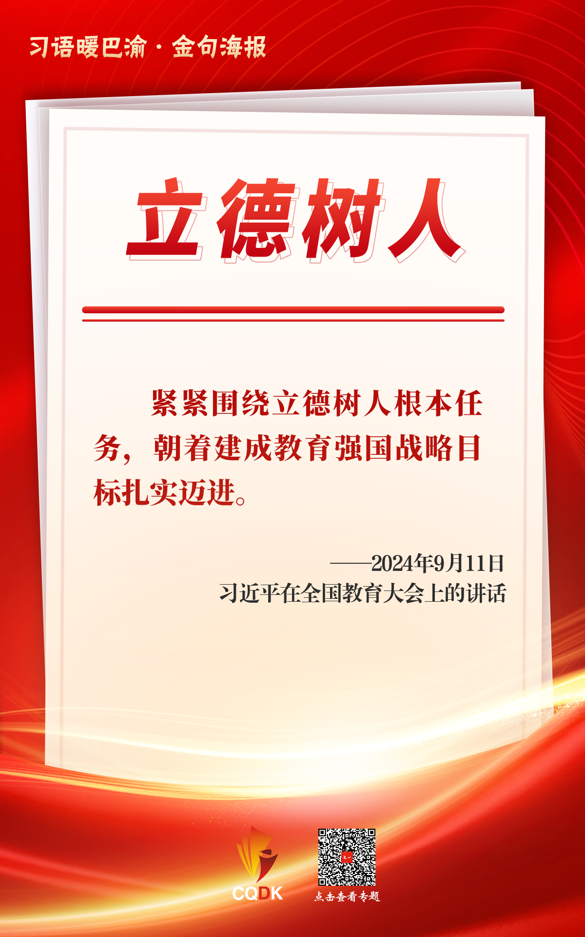 不闻大论,则志不宏;不听至言,则心不固。习近平总书记在全国教育大会上强调,紧紧围绕立德树人根本任务,朝着建成教育强国战略目标扎实迈进。作为一名基层教育工作者,深知在培养德智体美劳全面发展的莘莘学子,在建设教育强国的伟大征程中责任重大、使命光荣。