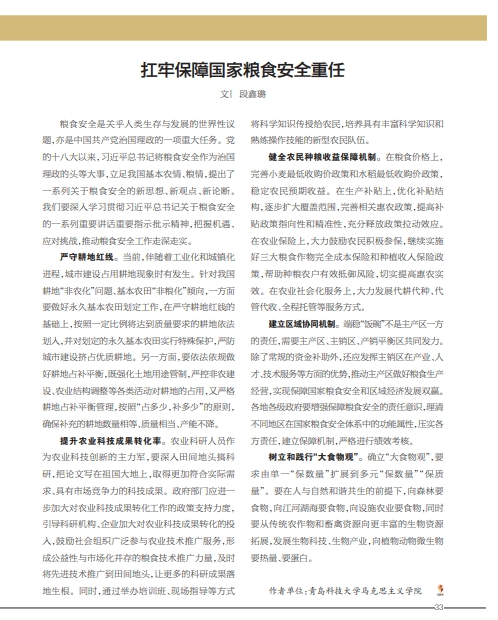 《当代党员》近期刊发青岛科技大学马克思主义学院通讯作者段鑫璐的研究文章《扛牢保障国家粮食安全重任》,文章建议从5个维度筑牢粮食安全。全文如下: