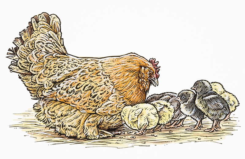 小鸡崽出壳之后,母亲在屋檐下围了一圈栅栏,作为养育鸡崽的专用领地。鸡娘卧则龙蟠,行则虎步,四邻窥伺粮草之鸡群,对其望而生畏。或有后生不畏,逡巡欲前者,鸡娘耸颈张嘴,张翼作扑击之势,则逡巡者尖叫乱飞,围观者惊骇响应,一哄而散矣。鸡娘淡然入内,咕咕呼儿唤女。