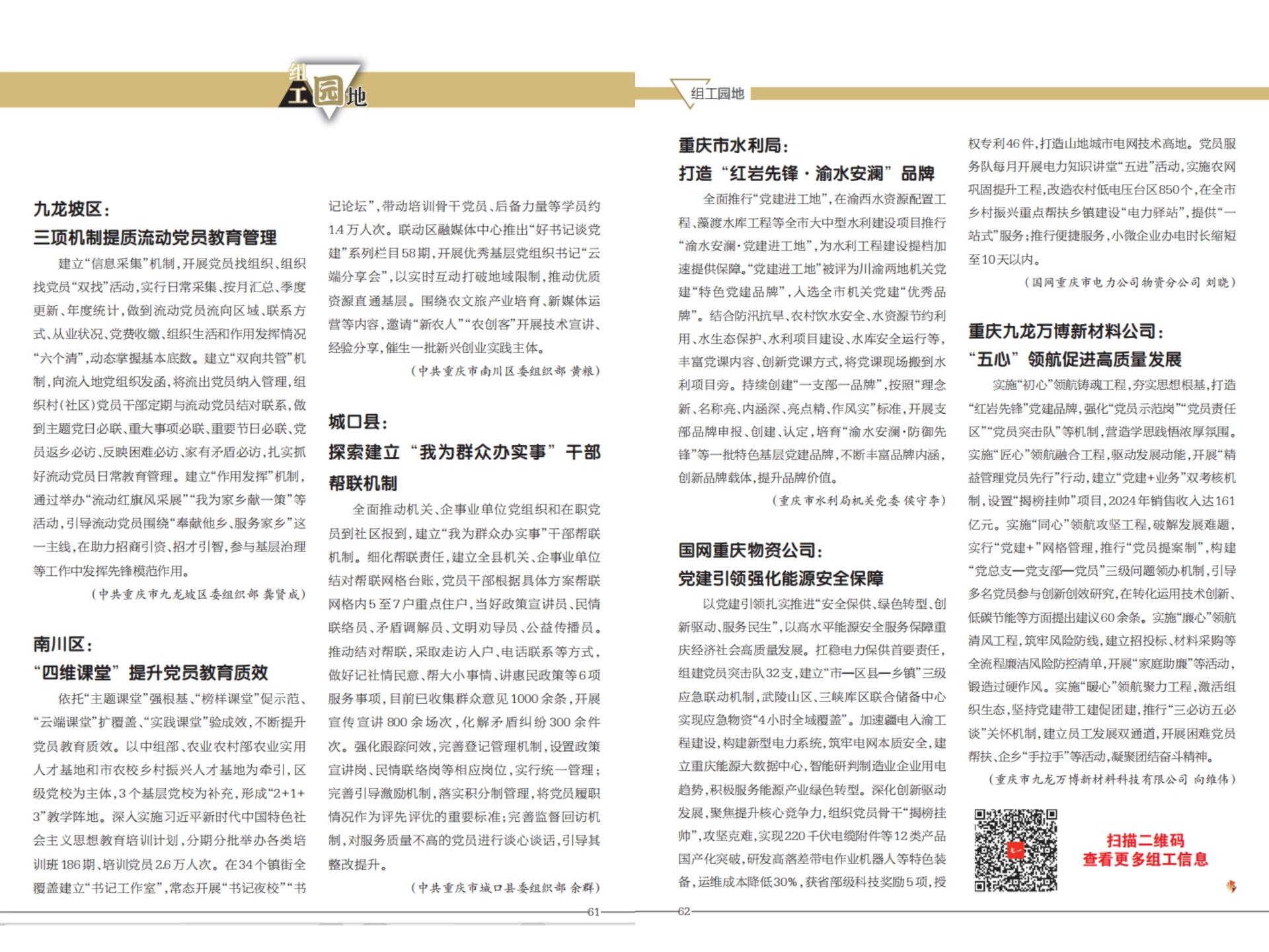 中共重庆市委机关刊物《当代党员》2025年第5期“组工园地”栏目刊发重庆市九龙坡区、南川区、城口县、重庆市水利局、国网重庆市电力公司物资分公司、重庆市九龙万博新材料科技有限公司有关的组工信息与党建探索。全文如下: